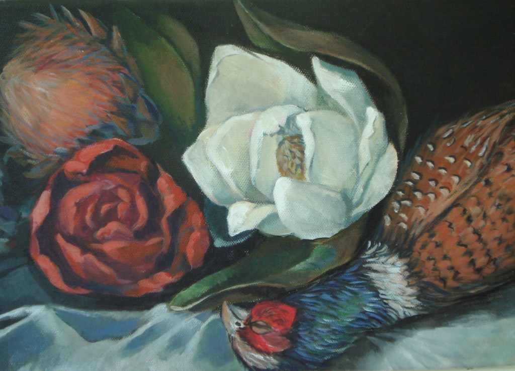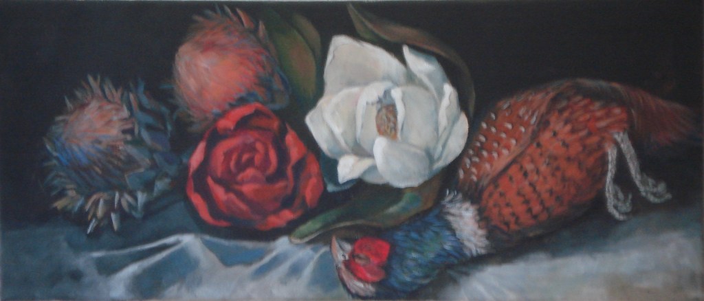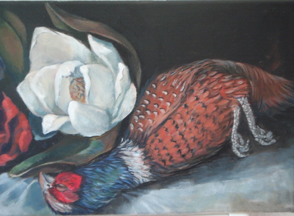 Still life with pheasant – Acrylic on canvas – 25 x 58 cmStill life with pheasant – DetailStill life with pheasant – DetailStill life with pheasant – DetailStill life with pheasant – DetailStill life with pheasant – DetailStill life with pheasant – Detail