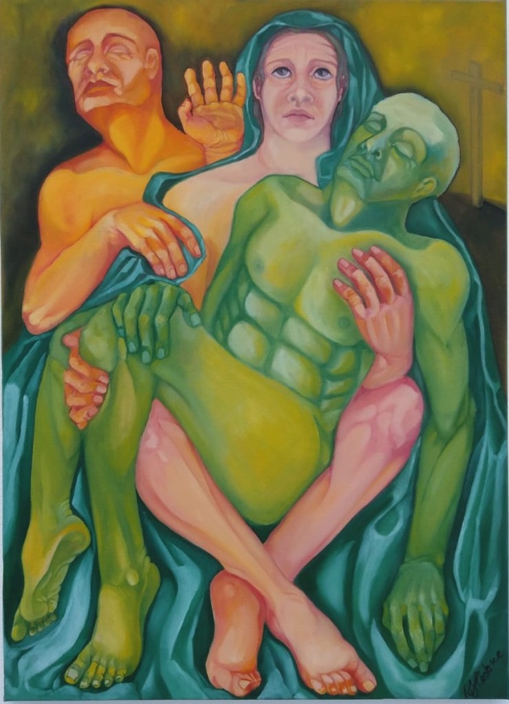 Morte del figlio è un’opera che raffigura il dolore di una madre per la perdita del proprio figlio, esattamente come quella più nota a cui la croce sullo sfonda fa riferimento.