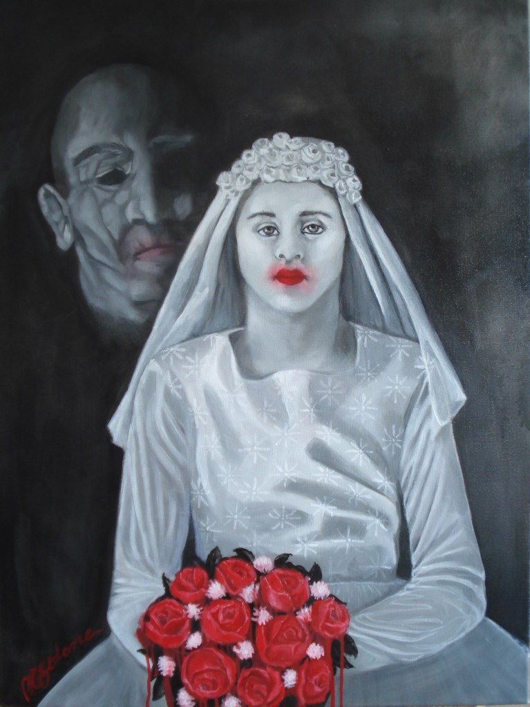 In tutto il dipinto dalle tonalità lucubri, l’unica nota di colore è rappresentata dal rosso acceso del bouquet nunziale che la ragazzina stringe tra le mani e del rossetto sbavato sulle sue labbra della sposa. Entrambi simbolo appunto di violenza.