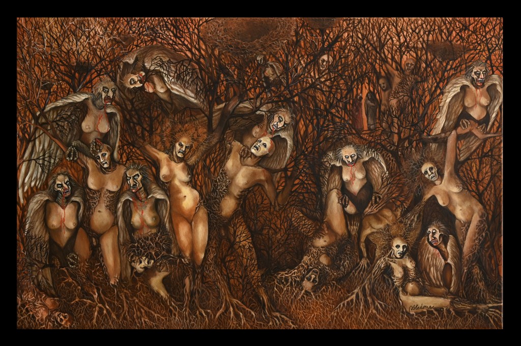 The painting is depicting the arrival of Dante e Virgilio in the Suicides forest where the souls of the damned gradually transform into trees and which will be eternally tormented by the Harpies, mythological monsters half women and half birds, who break branches.