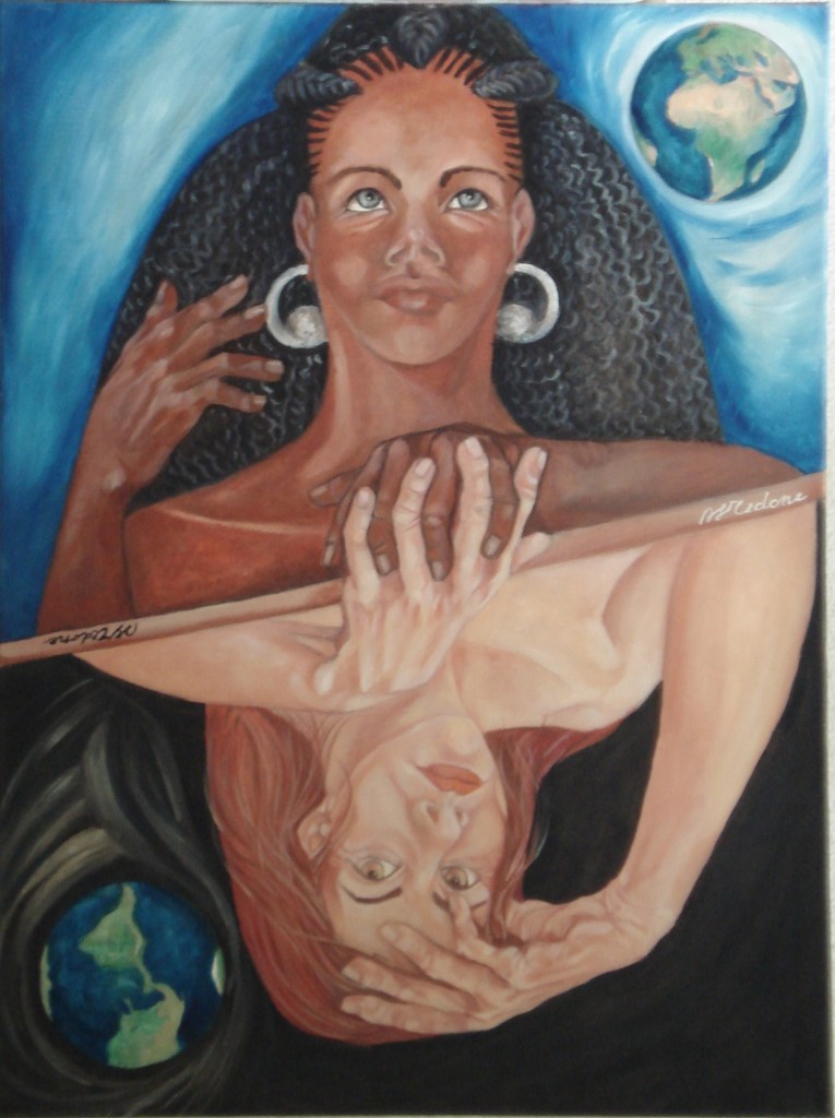 The two women, having different skin colors and coming from two different worlds such as day and night (see backgrounds), of different origins (the terrestrial globe next to each woman representing the Americas or Africa, notoriously considered one the rich continent and the other the poor) and clearly separated by a barrier (social conventions and prejudice) that refers precisely to playing cards, go beyond any barrier and join by holding hands, inextricably intertwining the fingers.